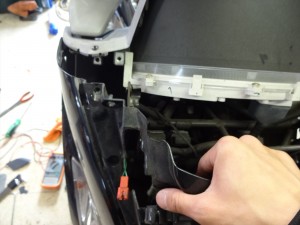 左右ともにボルトを取り外すと、ヘッドライト上のカバーが外れます。