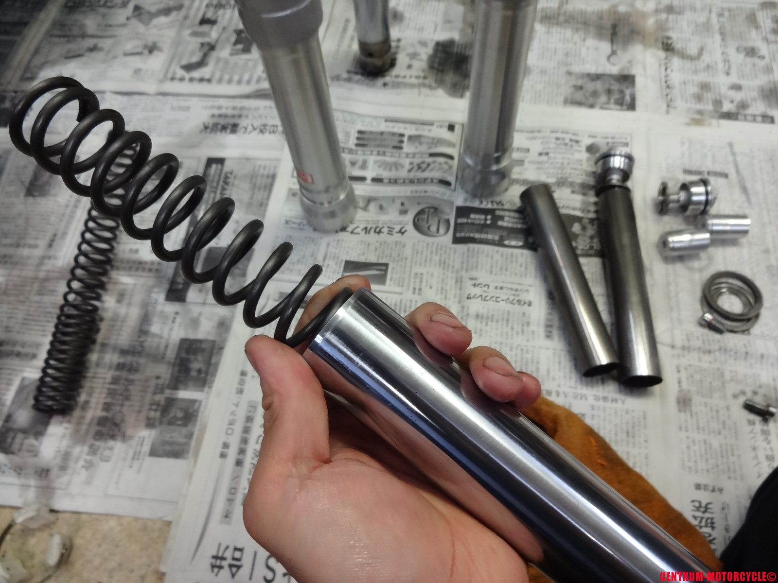 ブッシング(スライドメタル)、ワッシャの順番でインナーチューブに入れます。