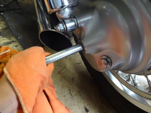 まずはスイングアーム右側のメッキのキャップを取り外します。