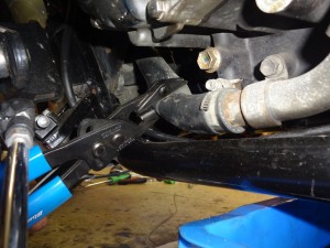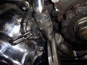 ウォーターポンプとホースの間にホースピックを差し込んで