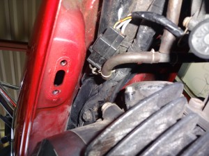 真上に向けて工具を差し込んで、ガソリンコックを