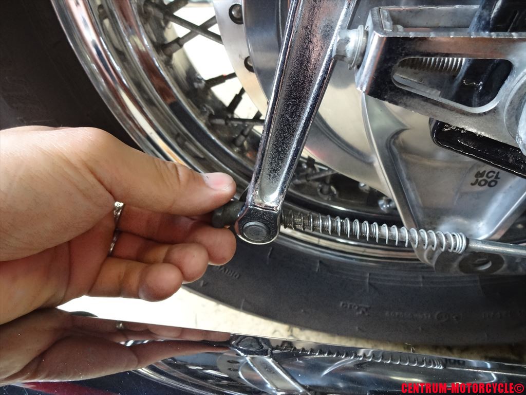 リヤホイールへの荷重が抜けるぐらいまでジャッキアップします。