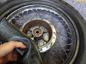 入れてしまってから、最後だけタイヤレバーを使用してビードを入れましょう。