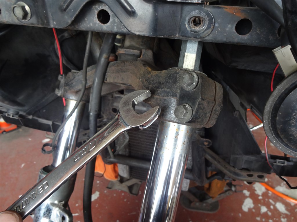 フロントフォークが取り付けられている為、この様に面倒な作業が必要となります。