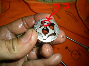 破片をとってからもう一度ポンプを仮組みして指で回してみると、