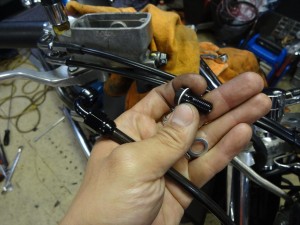 90度のバンジョーアダプタ、そしてキャリパー側には35度を採用しました。