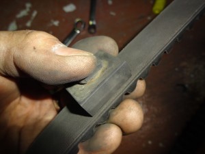 カットして曲げ終えたスプリング先端はベルトサンダーなどで