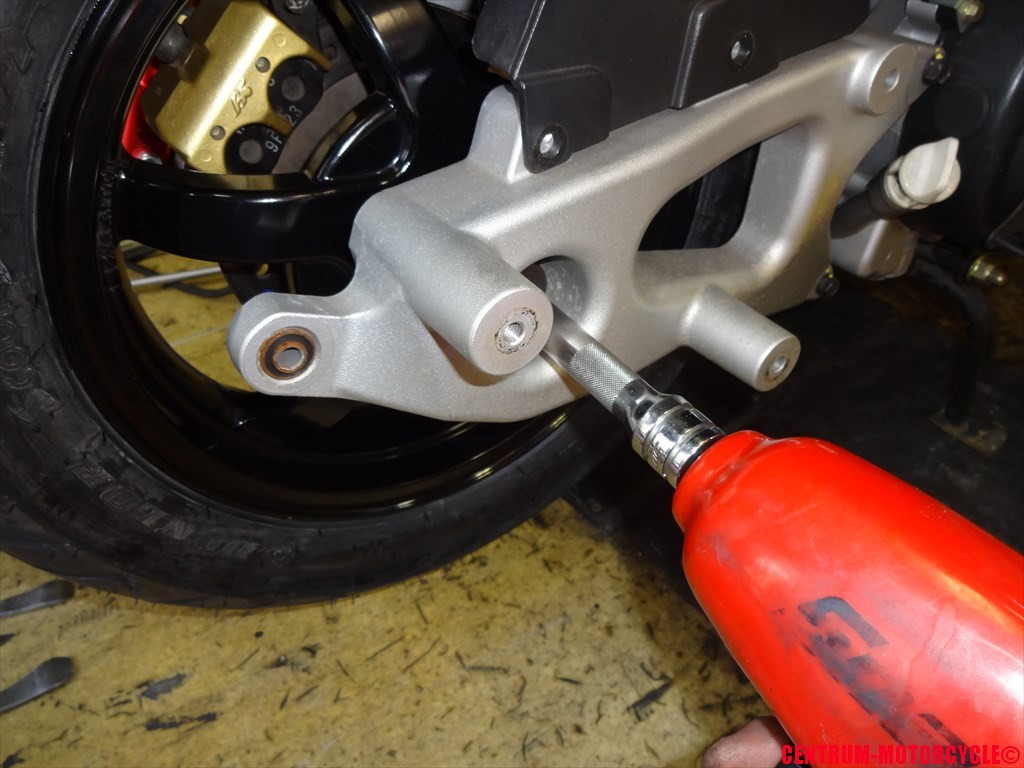 スイングアームの固定ボルトの錆を落として、表面にグリスを塗ってから