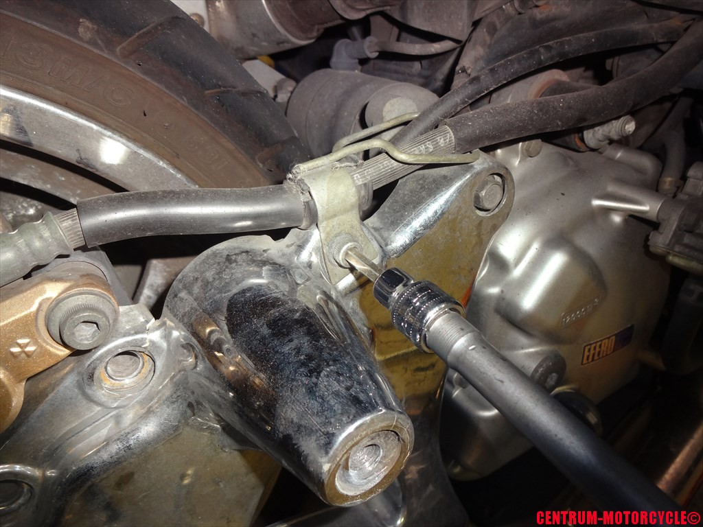 ジャッキアップしたらスイングアームの固定ボルトを取り外しましょう。