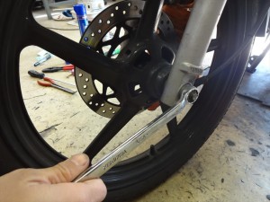 アクスルナットを取り外し終えたら、車体を後方へ押し上げて