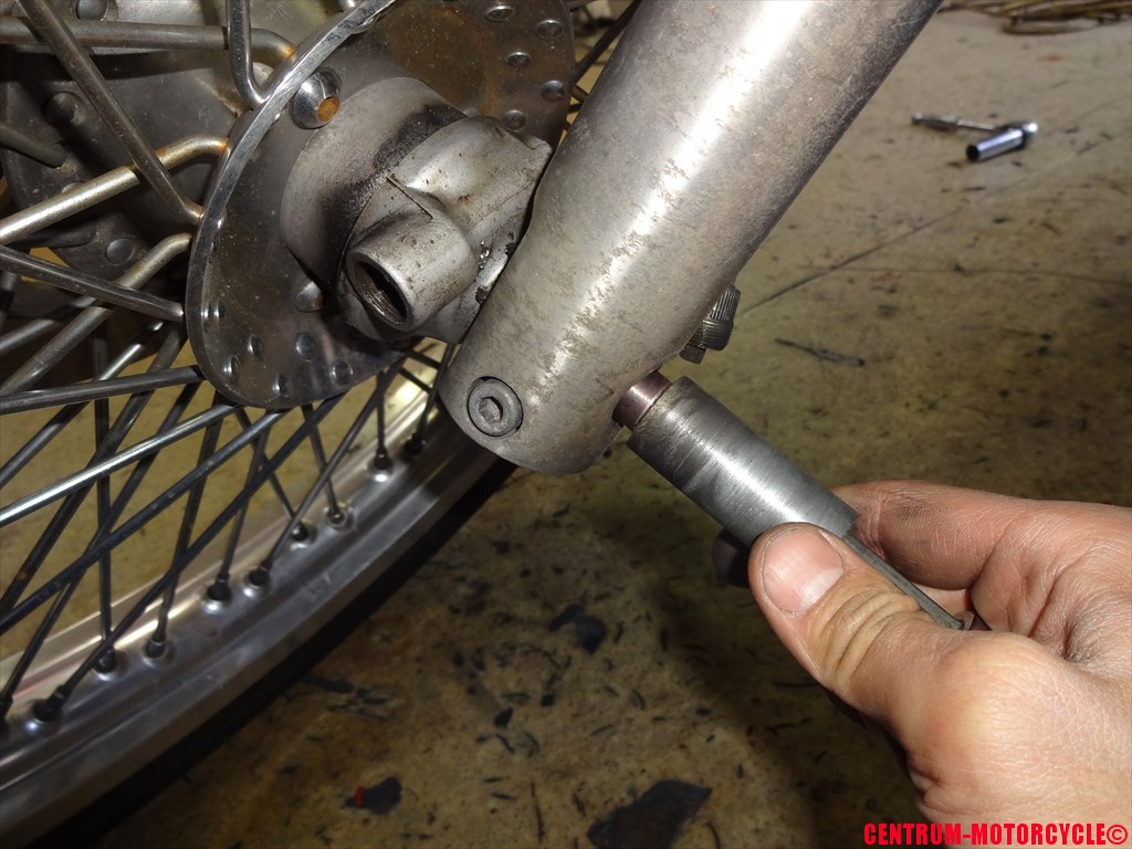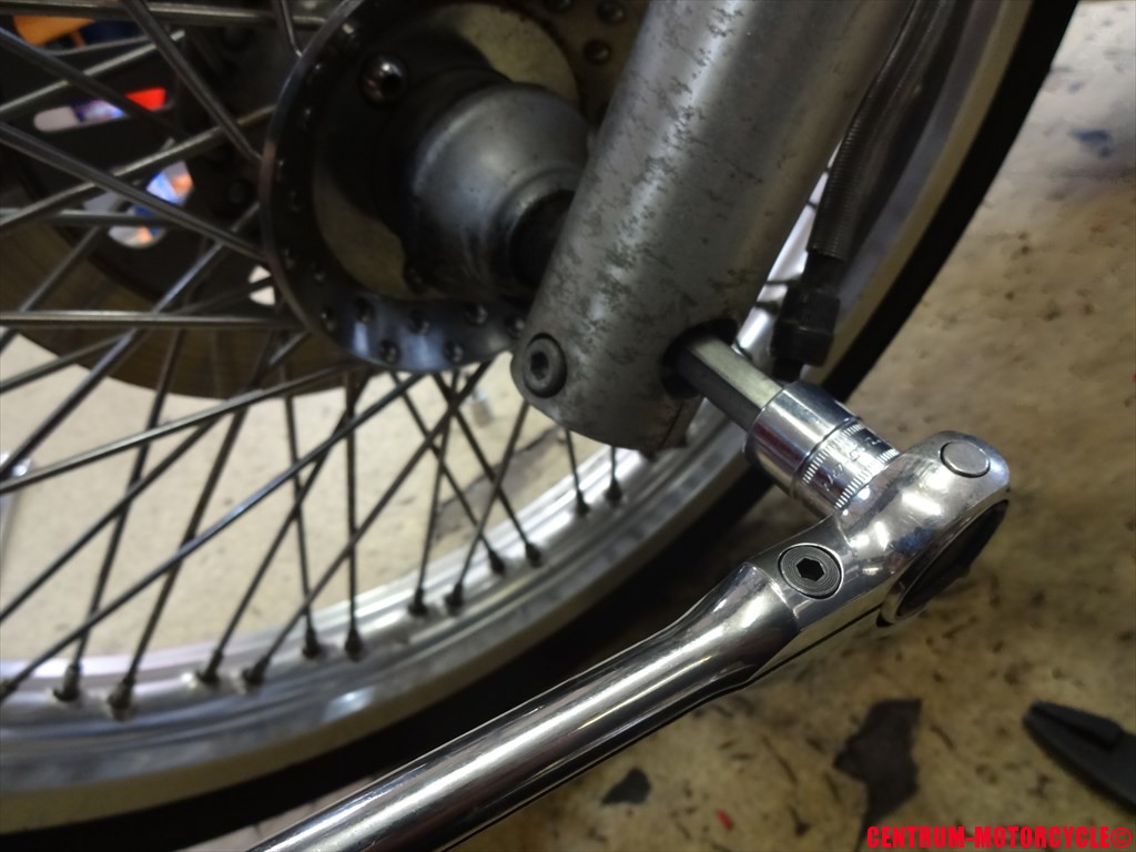 フォーク底部のクランプ部のボルトを緩めておきましょう。