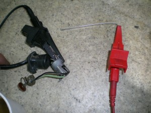 テスターとステンレスの棒を用意してこのように接続します。