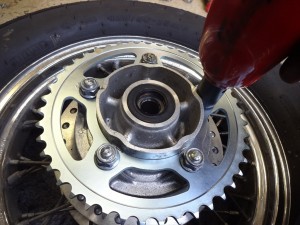 取り外し時と逆の手順でホイールをスイングアームに取り付けましょう。