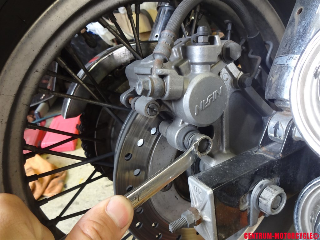 ブレーキキャリパーを固定しているボルトを取り外しましょう。
