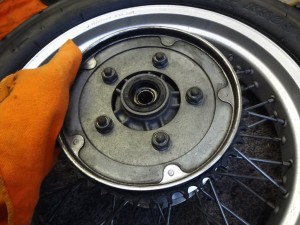 タイヤ交換が終わったリヤホイールを車体に取り付けて行きましょう。