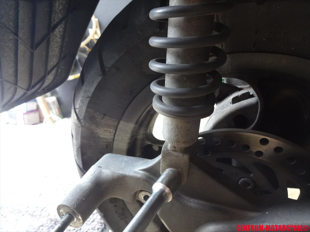 ブレーキホースがスイングアームに固定されているので、