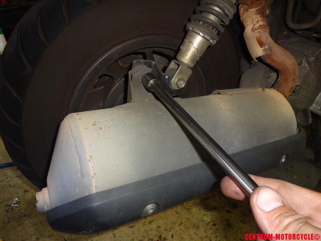 マフラーの取り外しが終わったら、続いてスイングアームの
