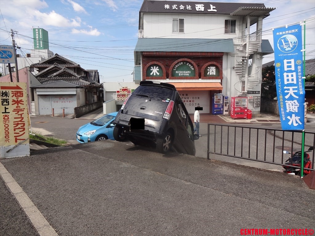 黒の軽自動車が歩道から、一段下の酒屋の駐車場内に