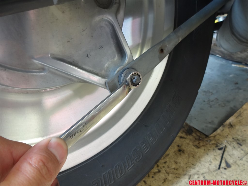 アクスルナットを緩めて取り外したら、次は
