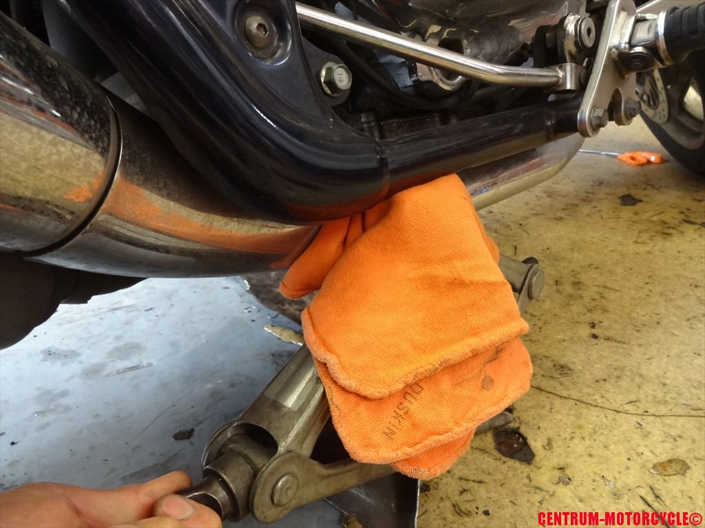 リヤホイールが浮いたところで予め緩めておいた