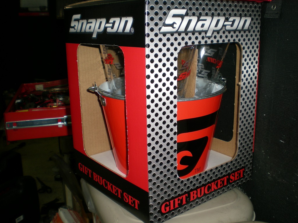 スナップオンレッドのバケツと、スナップオンのロゴ入り