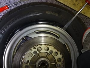 ホイールの間にタイヤレバーを入れようと