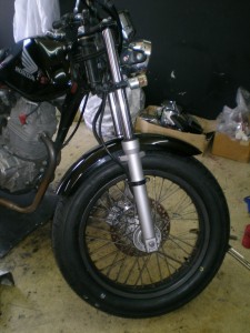 ブレーキキャリパーを取り付けたら、FTR223のフロントタイヤ交換作業は完了です♪