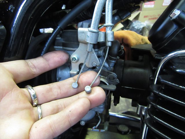 キャブレターリンケージ部から取外したスロットルケーブルを