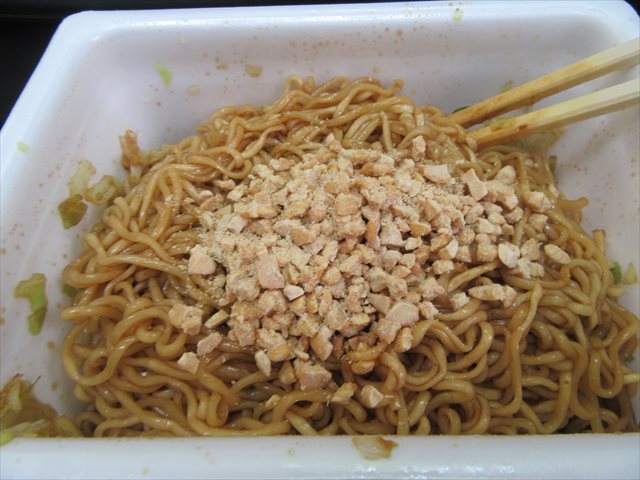 ぱっと見ではひきわり納豆と書かれていなかったら分かりませんね。ピーナッツか揚げ玉のように見えます。ちなみに、この状態ではまだ納豆臭は一切してきません。いつも通りの揚げ麺独特の匂いだけですね。