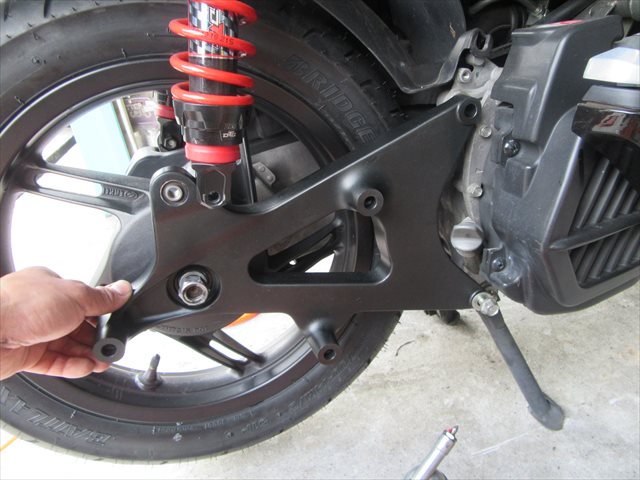作業時に発覚したので、念のためすぐにお客様にご連絡を入れましたが連絡が付かず、純正スイングアームを取付けて作業を完了し、数時間後にお客様より折り返しご連絡をいただき、状況をご説明差し上げてご承諾頂きました。