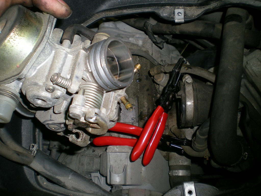 まずはキャブレターとマニーホールドの接続部分のバンドを緩めます。