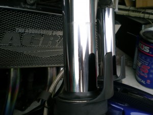 フロントフォークを上下逆さまにして、カバーのフチをプラスティック