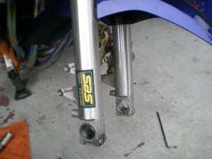 次はフロントフォーク底部のアクスルシャフトのゆるみ止めクランプ部を