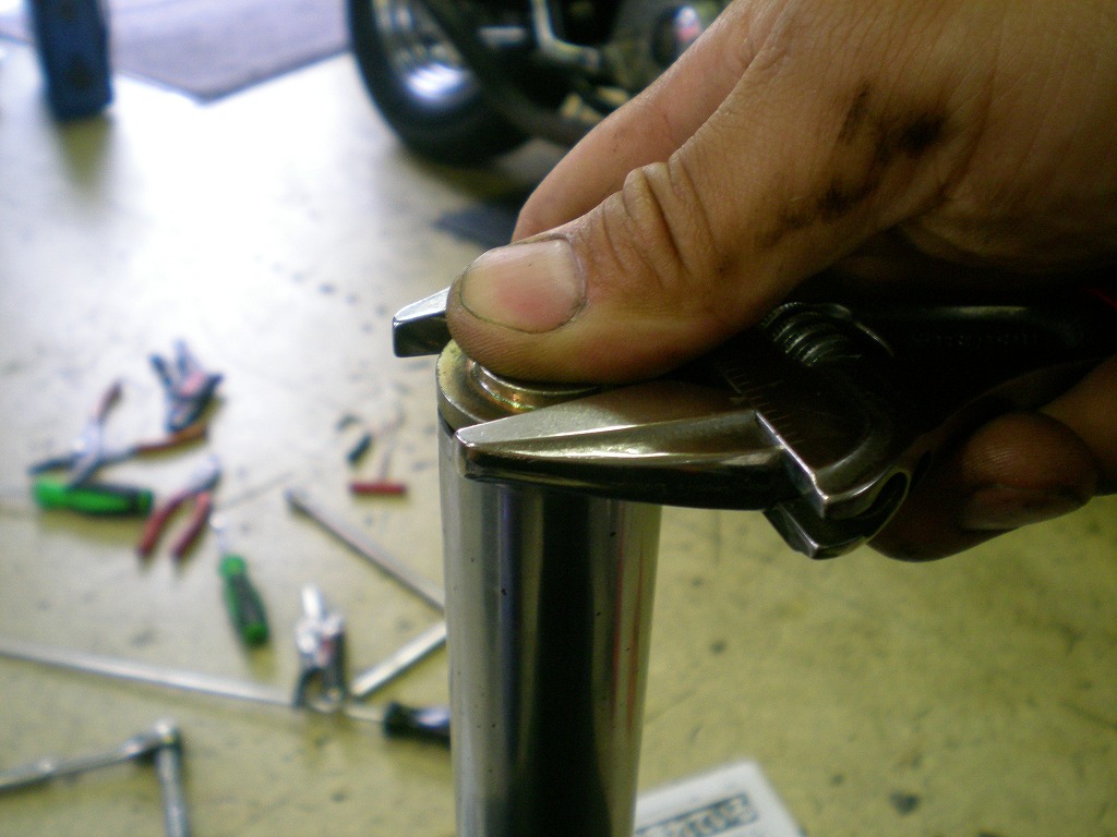 フォークオイルを抜き終わったら、次はフォークのトップキャップを