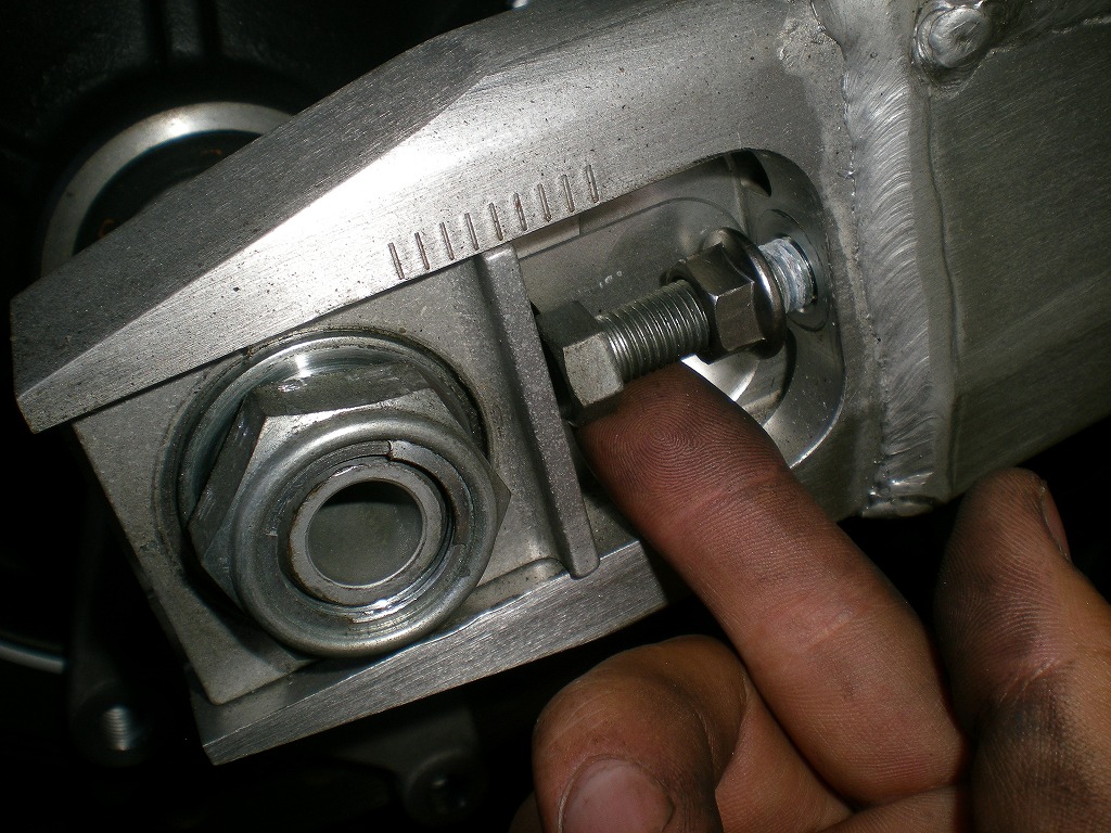 リヤホイールが浮いたらチェーン引きを完全に緩めます。