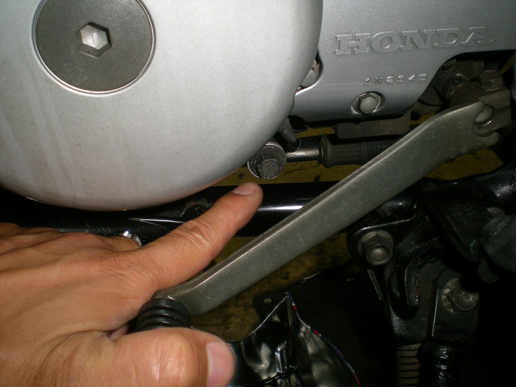 んでもう1つのドレンボルトってのがシフトペダル付近にあります。