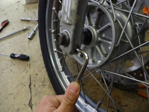 まずはブレーキキャリパーとスピードメーターケーブルを取り外します。